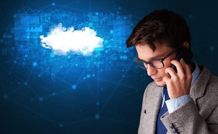 Person talking on the phone with blue cloud technology concept