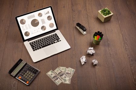 Pie chart graph icons and symbols on laptop screen with office accessories