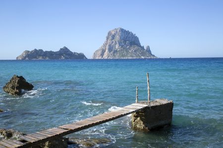 Pier at Hort Cove and Beach with Vedra Island; Ibiza, Spain