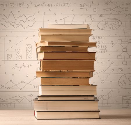 A pile of books with math formulas written in doodle style on background