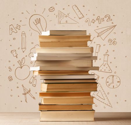A pile of books on table with school hand drawn doodle sketches and symbols