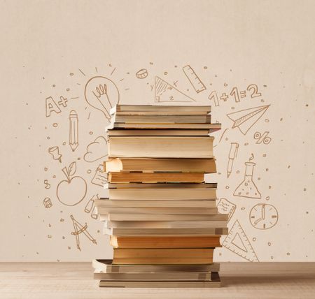 A pile of books on table with school hand drawn doodle sketches and symbols