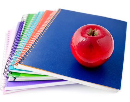 Pile of notebooks with an apple - isolated over a white background