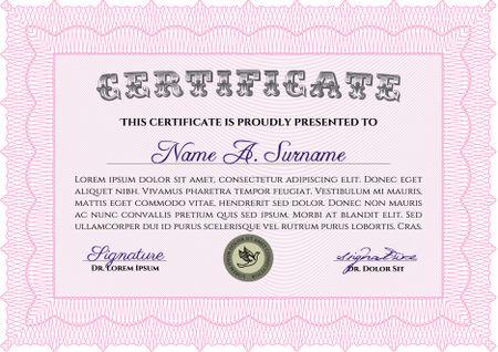 Pink Certificate, Diploma of completion with guilloche pattern and background, border, frame. Certificate of Achievement, Certificate of education, awards, winner.