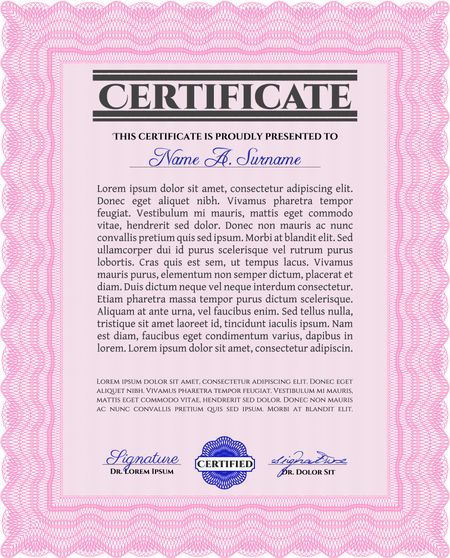 Pink Certificate template or diploma template. Vector pattern that is used in currency and diplomas.Complex background. Beauty design.