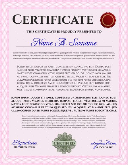 Pink Diploma or certificate template. With complex background. Vector illustration. Lovely design.