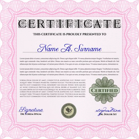 Pink Diploma or certificate template. Vector illustration. Lovely design. With complex background.