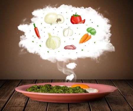 Plate of food with vegetable ingredients illustration in cloud on wood deck