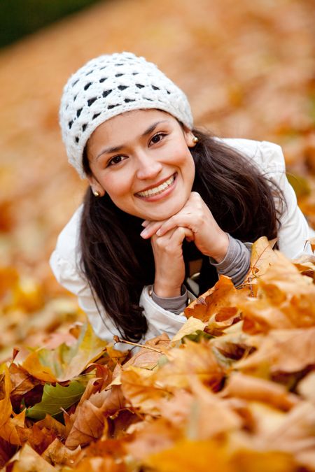 Portrait of an autumn woman lying over leaves and smiling