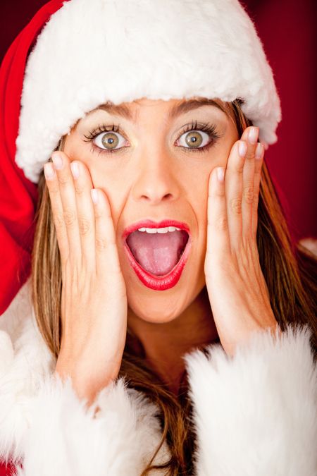 Portrait of a beautiful female Santa looking surprised over Christmas