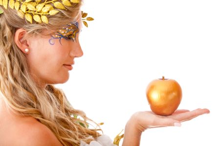 Portrait of a beautiful Greek goddess holding an apple- isolated over white