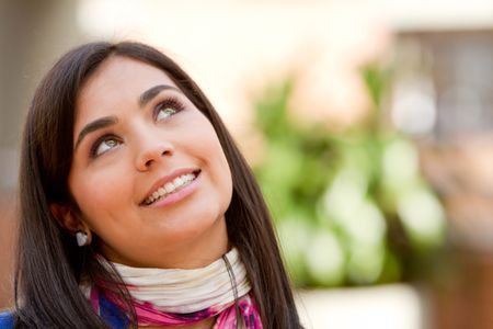 Portrait of a beautiful thoughtful woman smiling outdoors
