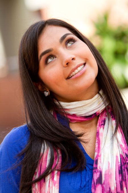 Portrait of a beautiful thoughtful woman smiling outdoors