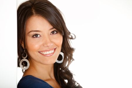 Portrait of a beautiful woman leaning against a wall