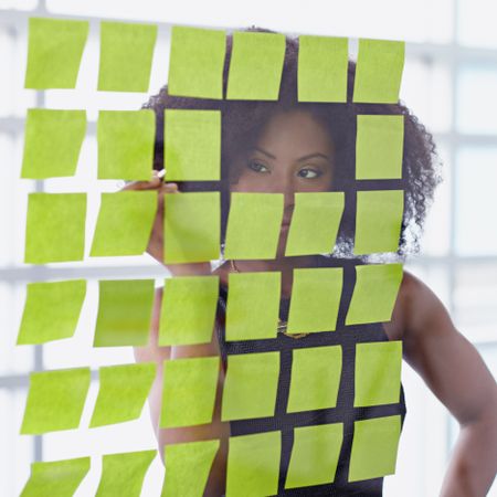Portrait of a business woman with an afro behind sticky notes in bright glass office