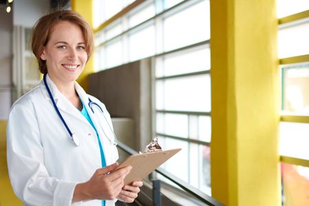 Portrait of a female doctor holding her patient chart in bright modern hospital