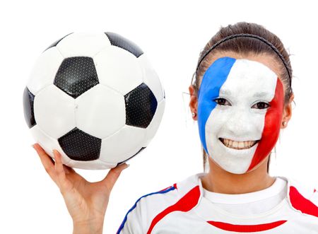 Portrait of female french football fan with painted face - isolated over white