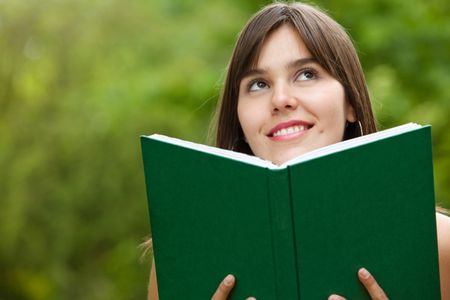 Portrait of a female student with a book outdoors
