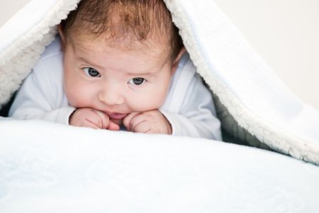 Portrait of a gorgeous cute baby under the blankets