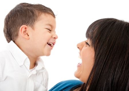 Portrait of a happy mother and son laughing - isolated over a white background
