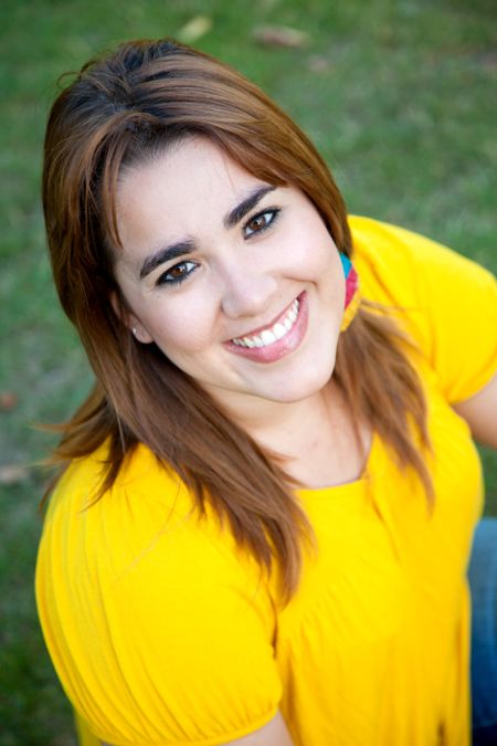 Portrait of a happy woman sitting on the grass outdoors