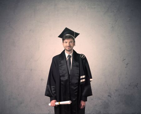 Portrait of a happy young graduate student on grungy background