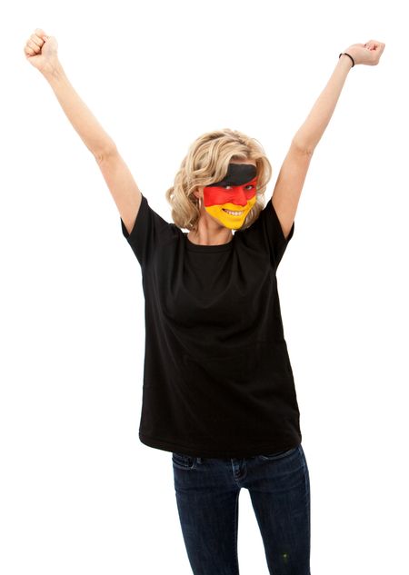 Portrait of a joyful woman with the german flag painted on her face isolated over white