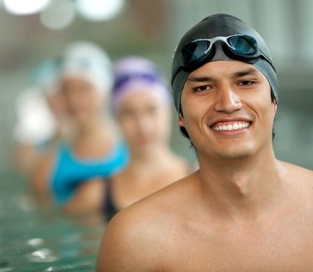 Portrait of a male swimmer wearing a swimming cap and goggles