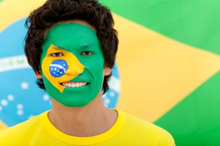 Portrait of a man with the brazilian flag painted on his face