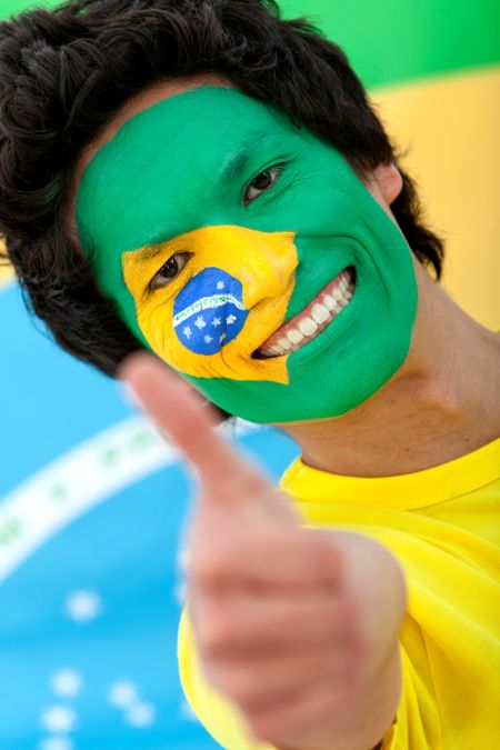 Portrait of a man with the Brazilian flag painted on his face - isolated