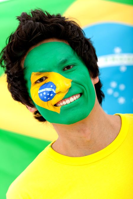Portrait of a man with the Brazilian flag painted on his face