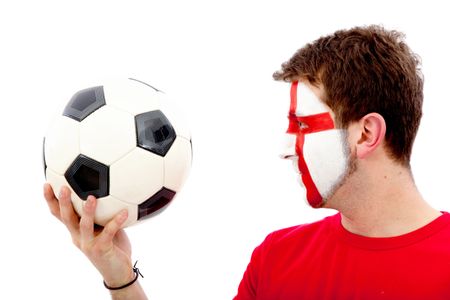 Portrait of a man supporting his team with the english flag painted on his face isolated over white