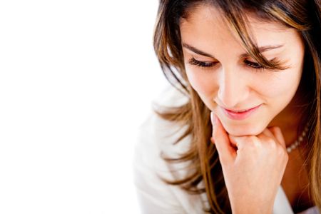 Portrait of a pensive woman looking down - isolated over a white background