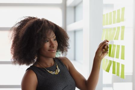 Portrait of a smiling business woman with an afro in bright glass office