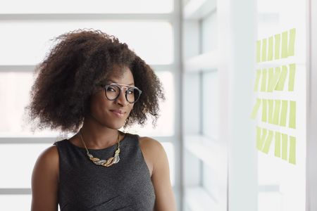 Portrait of a smiling business woman with an afro in bright glass office