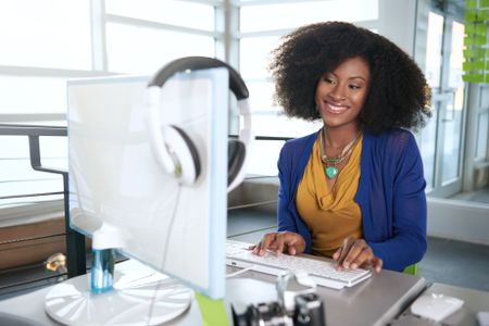 Portrait of a smiling woman with an afro at the computer in bright glass office