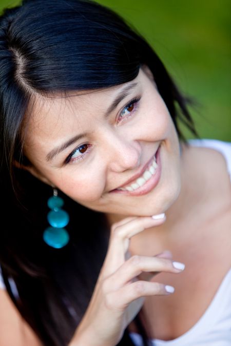 Portrait of a thoughtful woman smiling outdoors