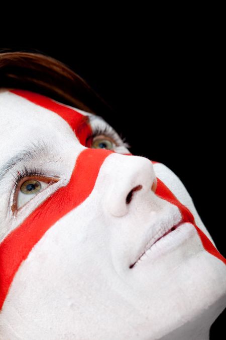 Portrait of a woman with the english flag paited on her face - over a black background