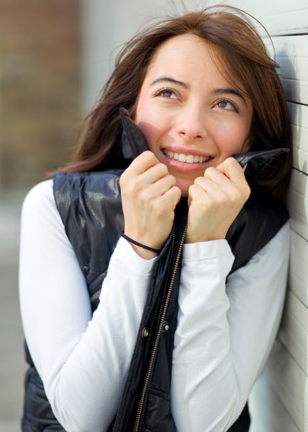 Portrait of a woman feeling cold outdoors holding her vest