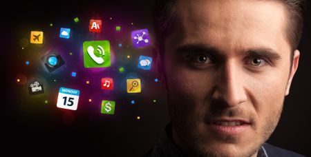 Portrait of a young businessman with colorful applications next to him on a dark background