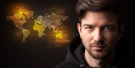 Portrait of a young businessman with a world map and numbers next to him on a dark background