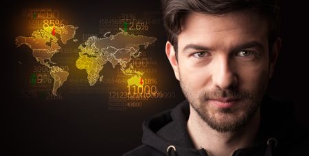 Portrait of a young businessman with a world map and numbers next to him on a dark background