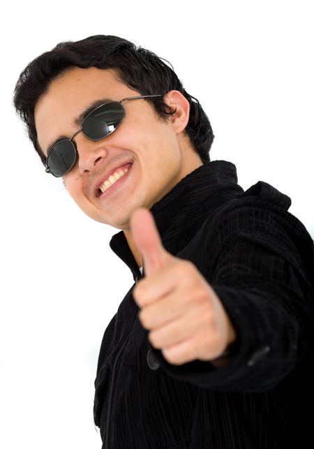 positive and happy young man with his thumb up and wearing sunglasses