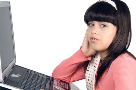 Pretty brunette schoolgirl in pink looks at you, notebook computer in front of her, isolated on white