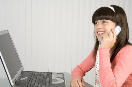 Pretty brunette schoolgirl in pink talking on cell phone, with bright smile, sitting by notebook computer and blinds