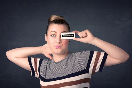 Pretty girl with censored paper sign holding in hand