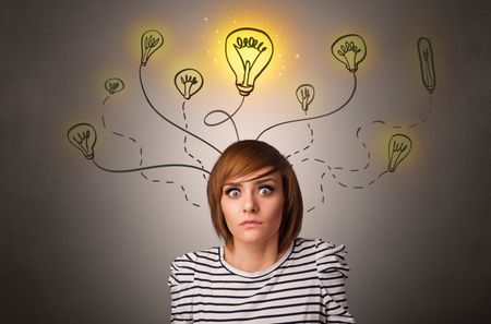 Pretty girl with draw bulbs above her head with different solutions concept