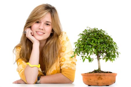 pretty girl portrait with a boinsai tree next to her - isolated