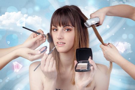Pretty girl portrait prepare with diamonds and cloudy wallpaper