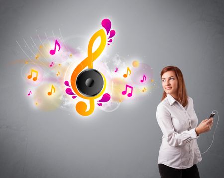 pretty girl singing and listening to music with musical notes getting out of her mouth